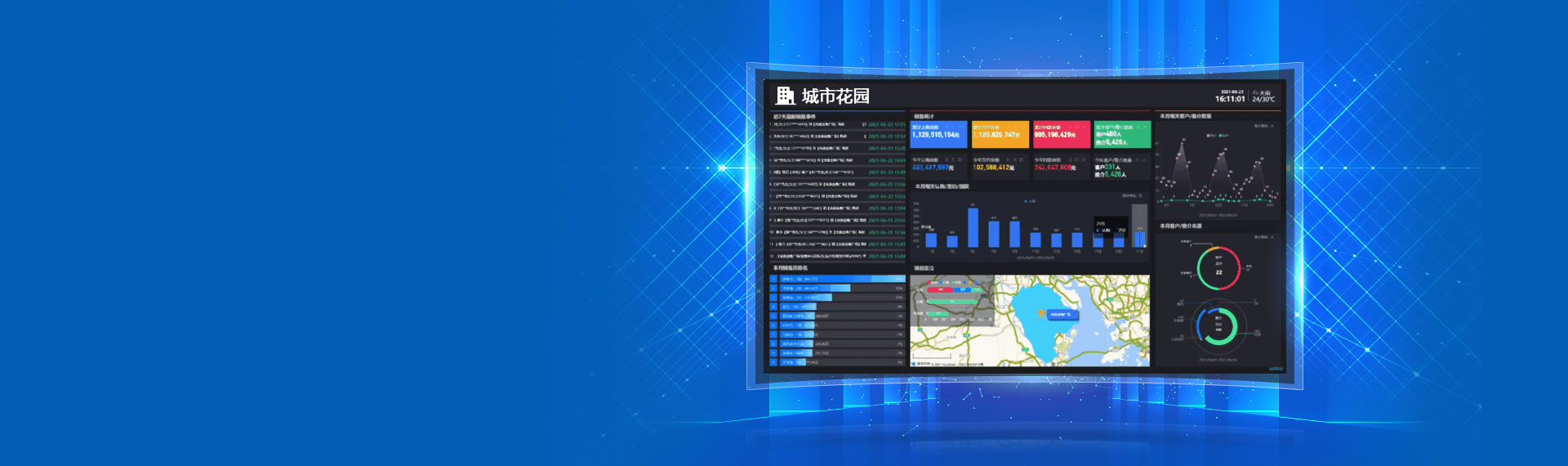 擺脫傳統枯燥的數據報表,用炫酷的全局可視化大屏實時展示各種營銷數據,各業務板塊重點數據分析:客戶來源、客戶轉化率、銷售去化率、簽約回款等動態入賬。實現跨地域全局管控,助力運營決策。